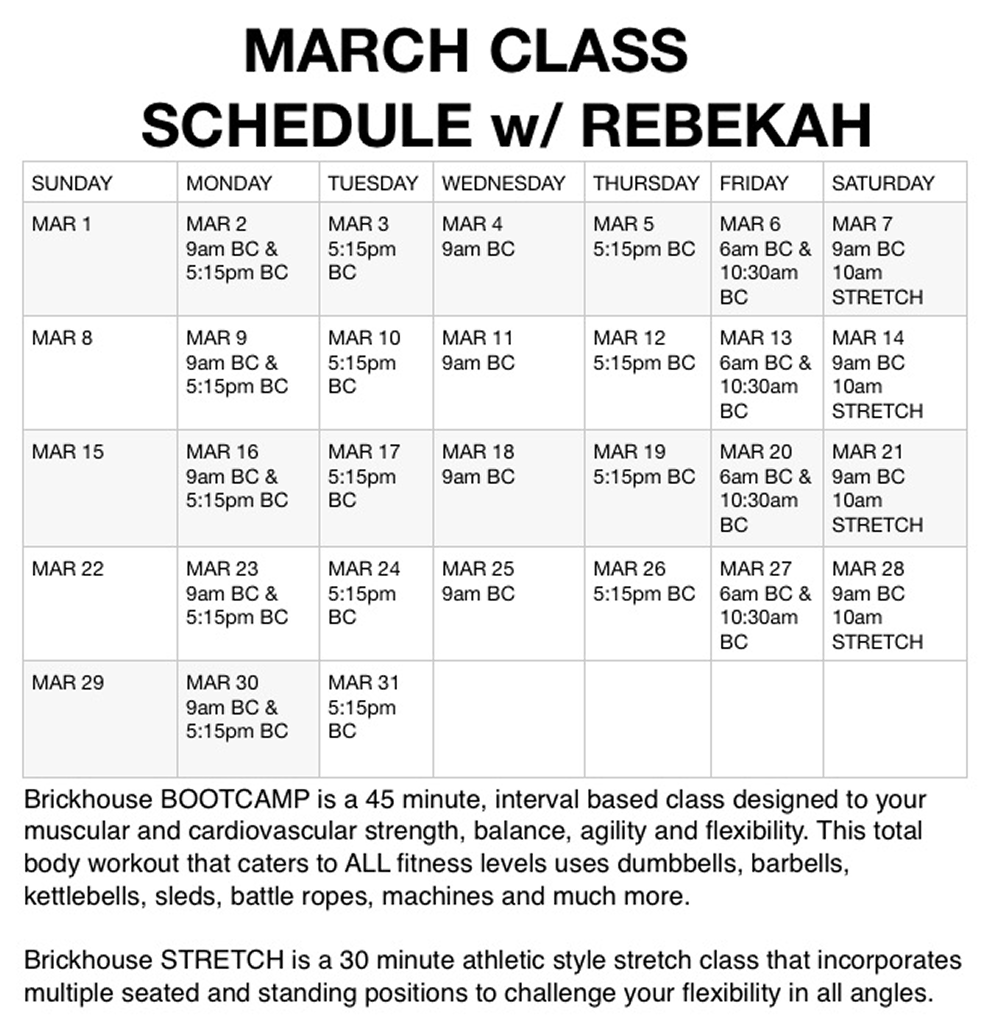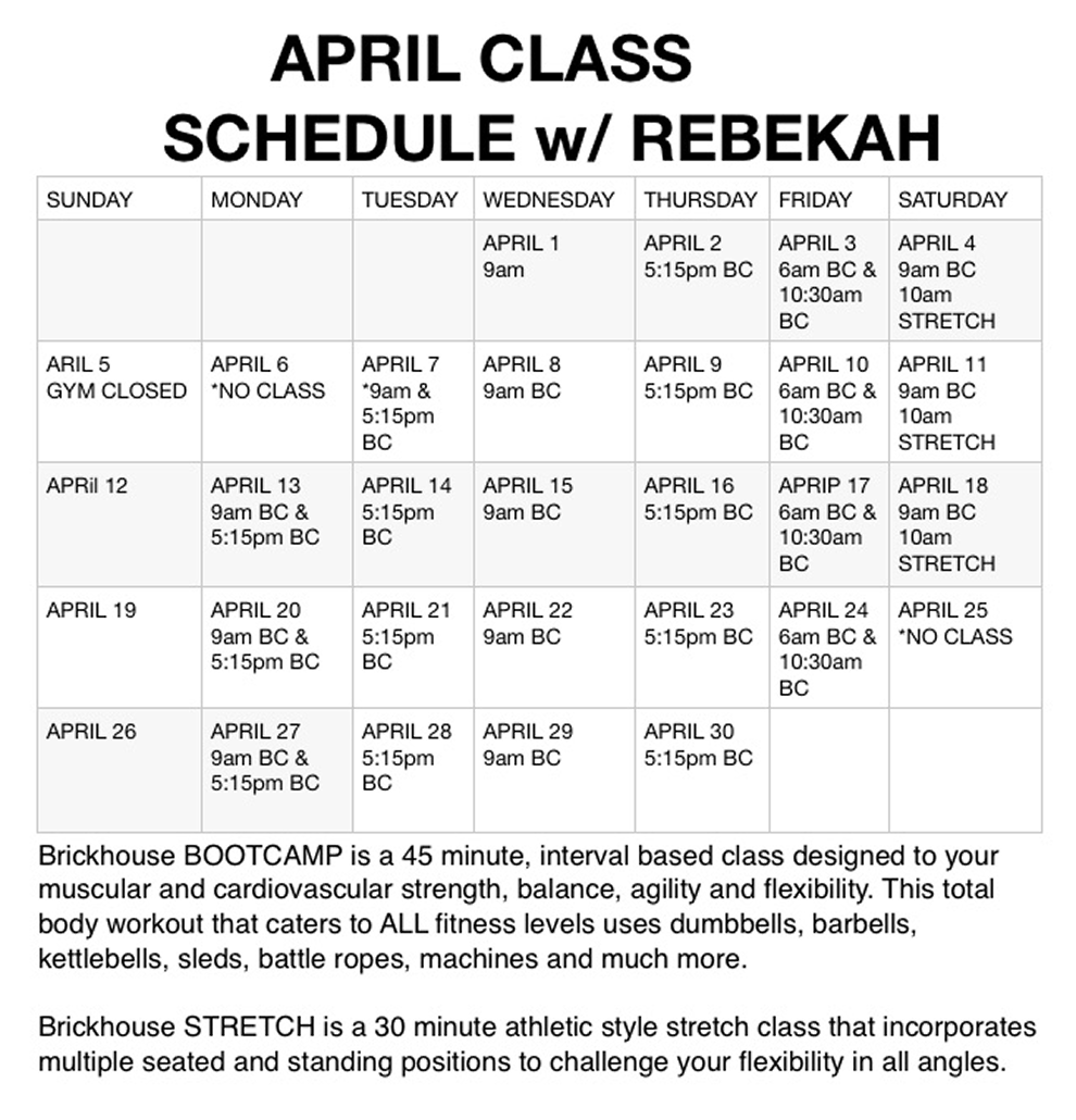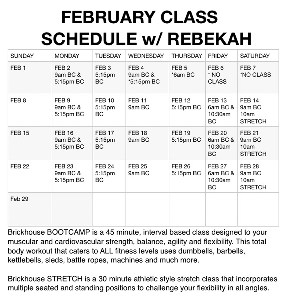 Join our certified personal trainer and instructor, Rebekah Sturkie, everyday for an amazing class experience designed to work you from head to toe. Perfect for all ages and experience levels!