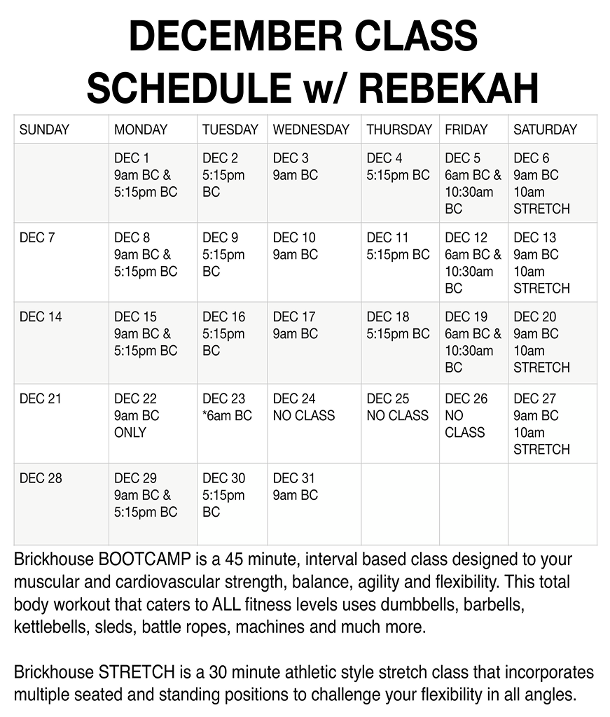Join our certified personal trainer and instructor, Rebekah Sturkie, everyday for an amazing class experience designed to work you from head to toe. Perfect for all ages and experience levels!
